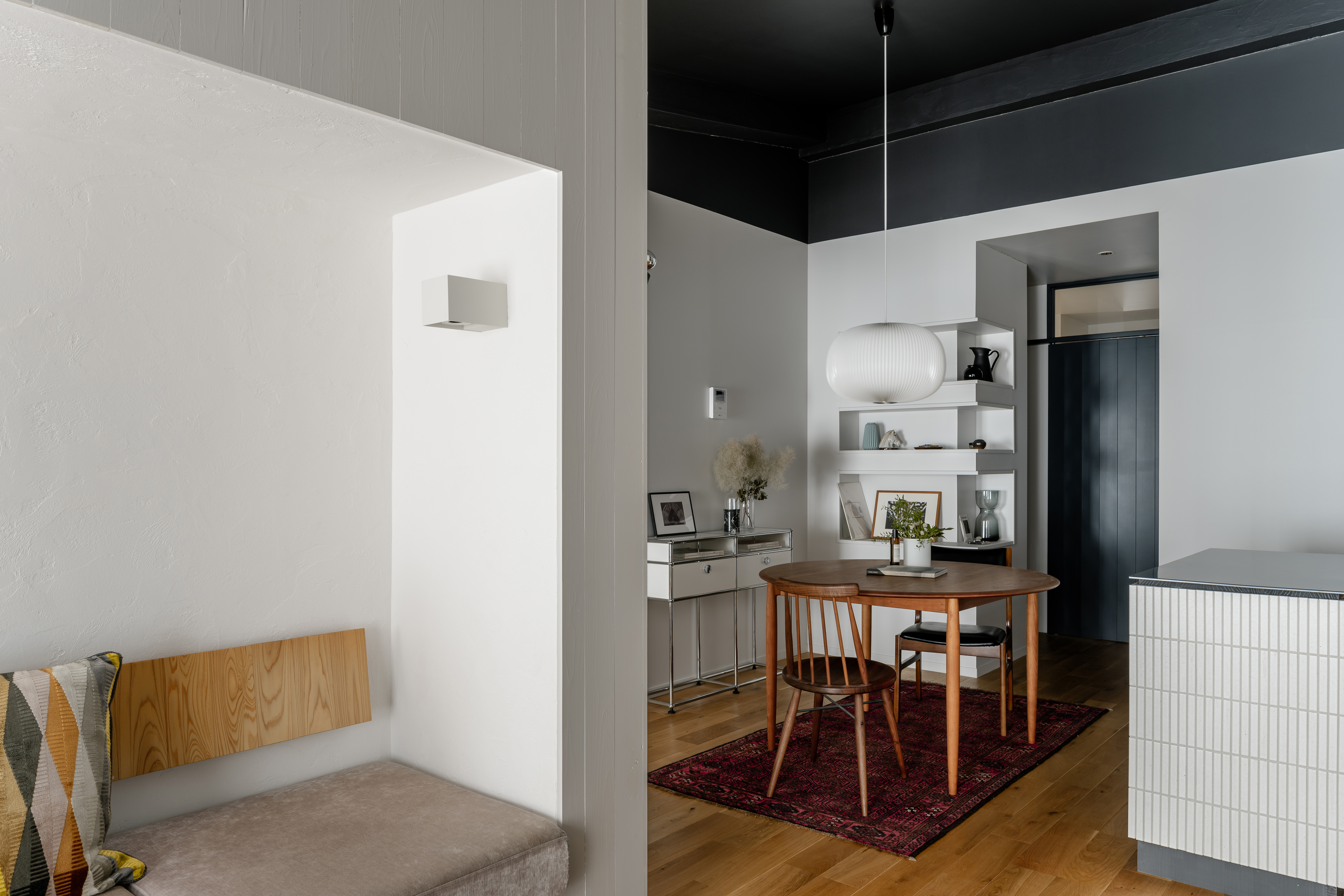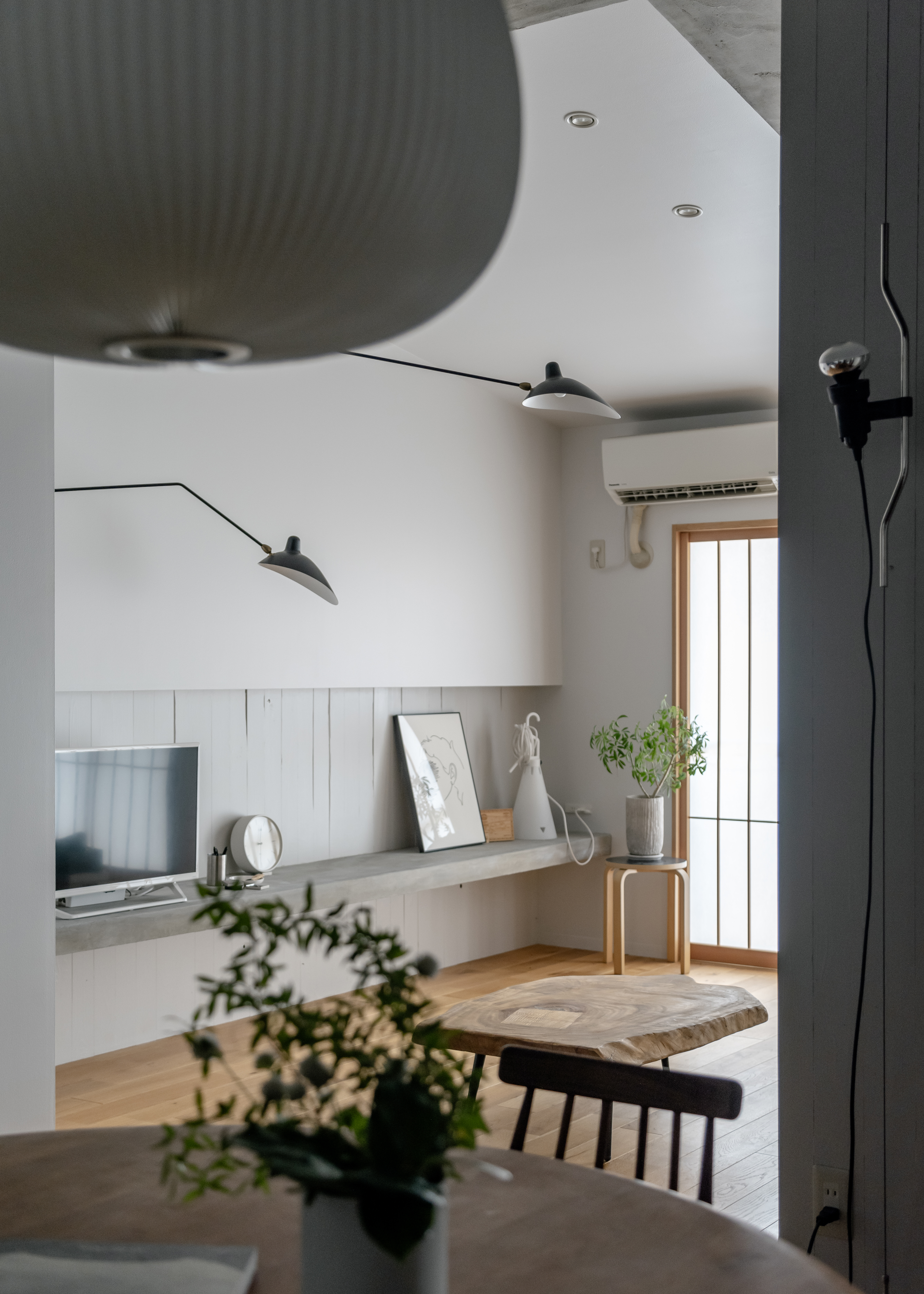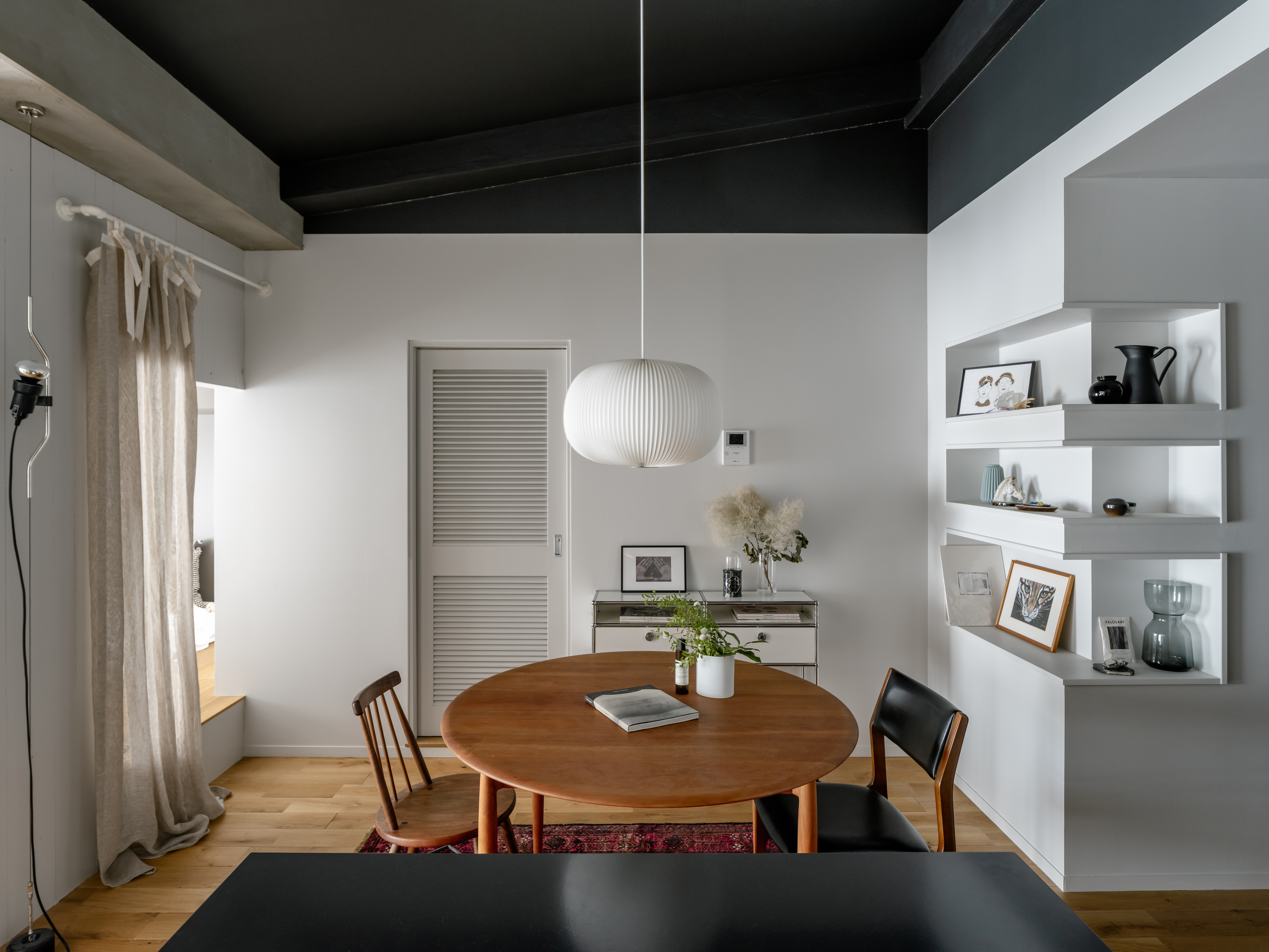 無垢材や漆喰、障子やブラックの天井など、質感のある素材の中に、