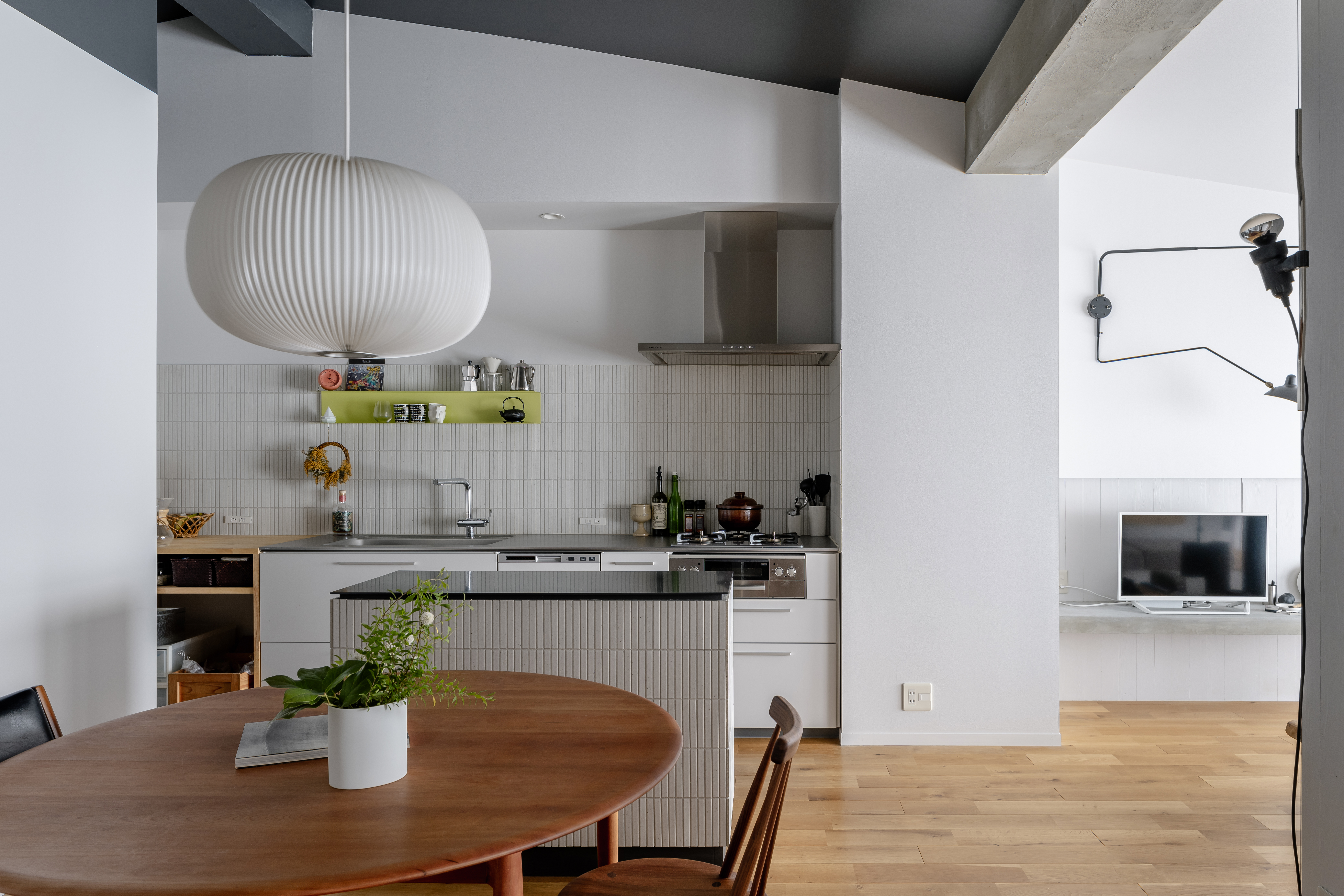 勾配天井の大空間の中心にご夫婦のご希望だった「ヌック」を配置。