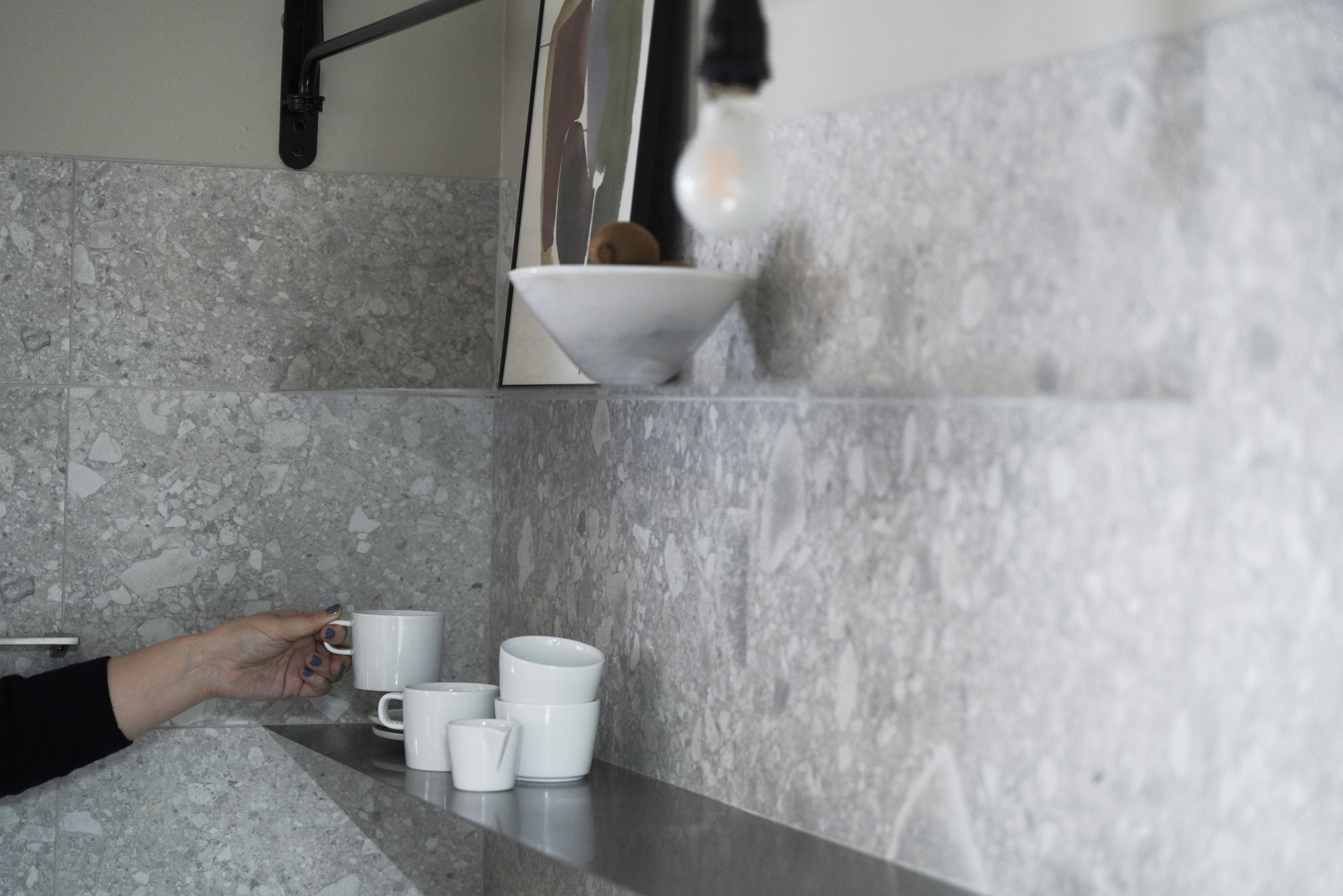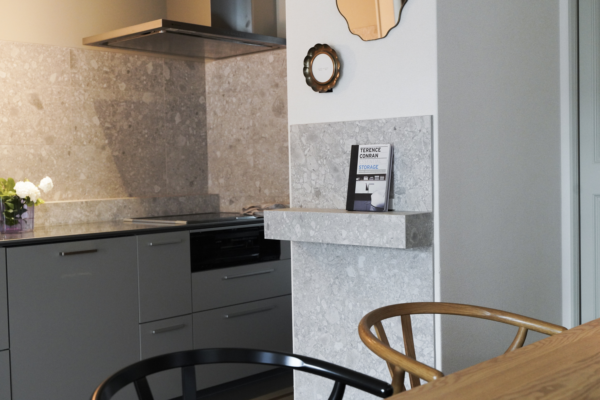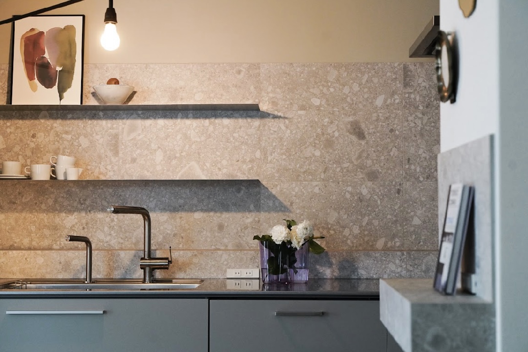 キッチンはメインとなる石目のタイルを中心に、
