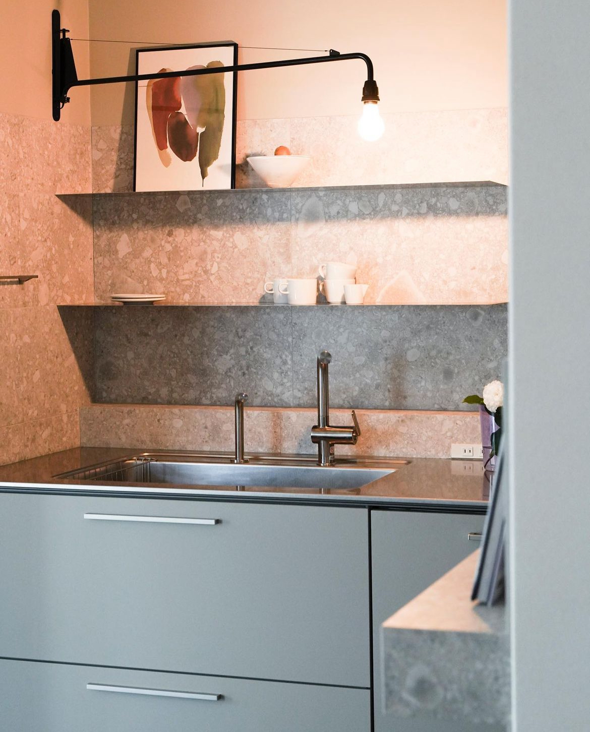 キッチンの扉の色に拘ったり、海外の照明やステンレスの飾り棚などを取り入れ、